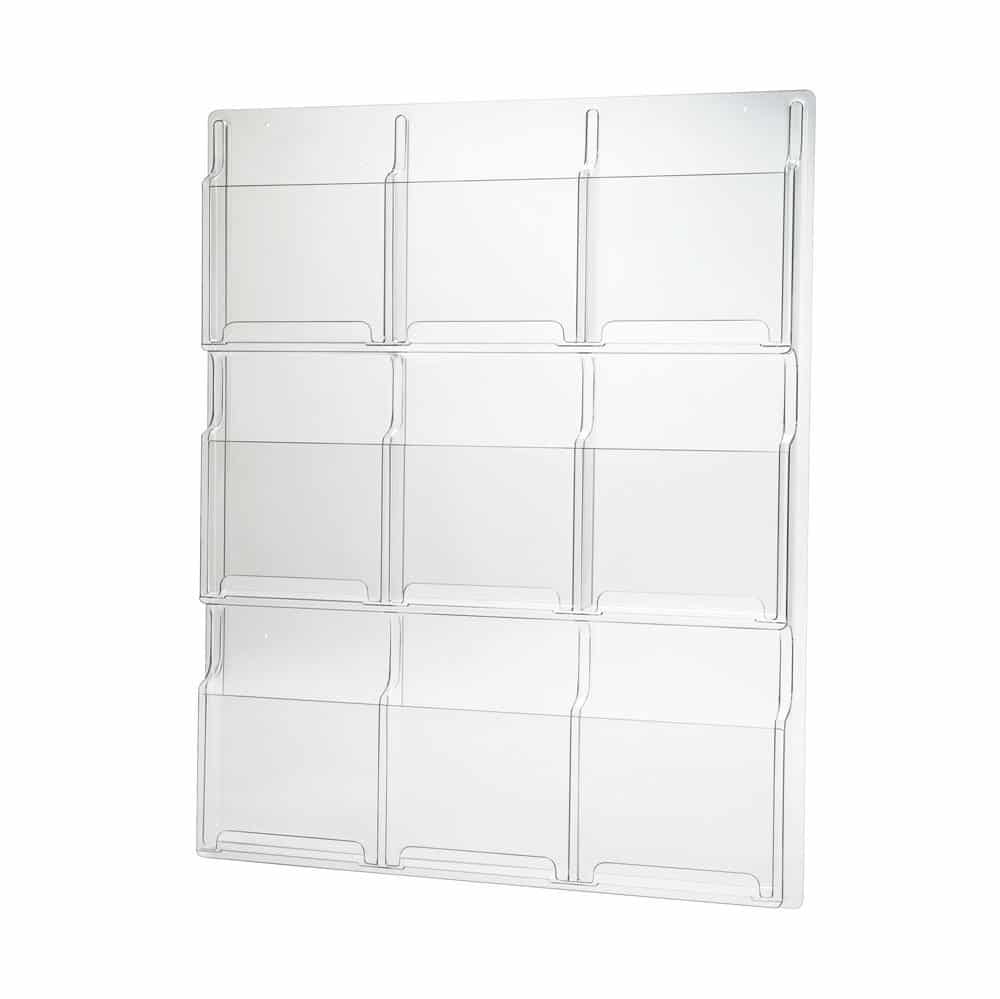Brosjyreholder for veggmontering med 9 lommer til format stående A4. Modellen er en plassbesparende, robust og effektiv brosjyreholder. Den er enkel og stilfull, og egner seg til å presentere forskjellige brosjyrer. Lommene er transparente, og hver brosjyre presenteres i sin helhet.