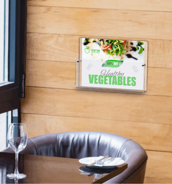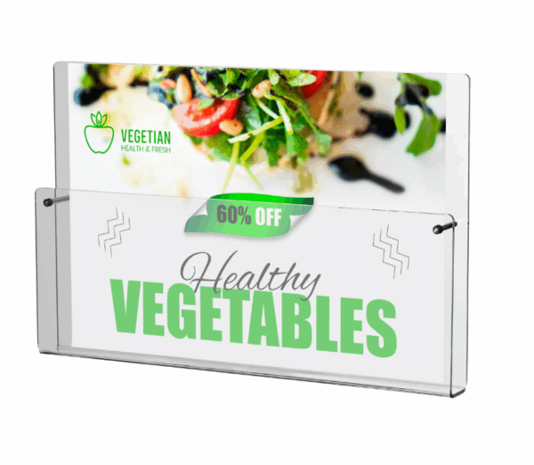 Brosjyreholderen lagerføres i formatene liggende A3, A4, A5 og A6. Som produsent kan vi lage andre størrelser ved bestilling fra 30 stk.