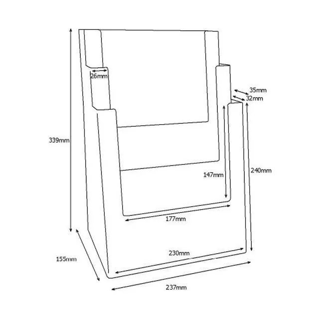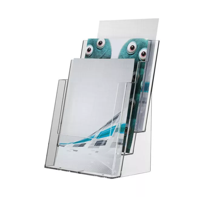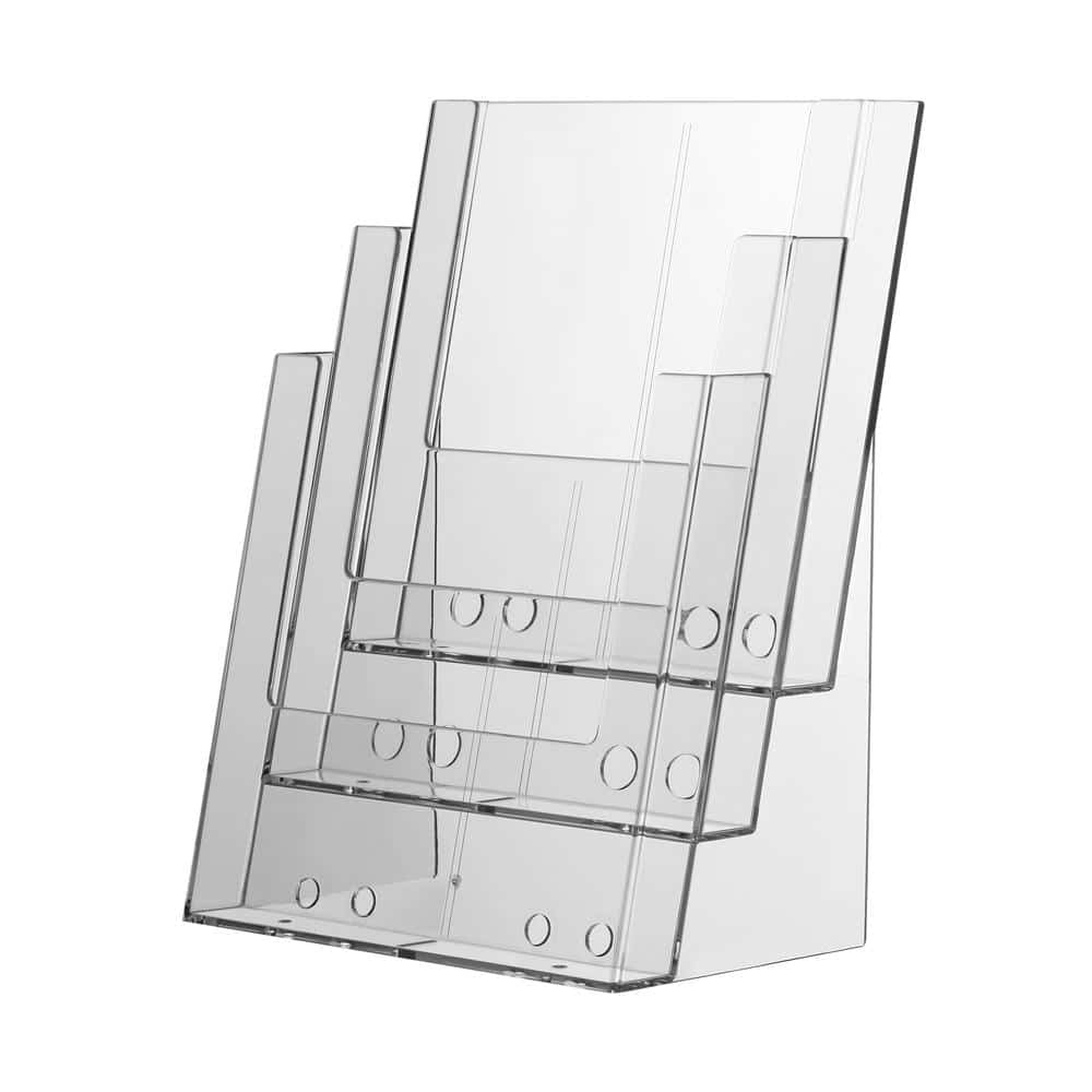 En klassisk, frittstående dispenser med tre separate brosjyrelommer plassert bak hverandre. Egner seg til tynne brosjyrer, flyveblad, produktark, mv. i format A4 og A5.