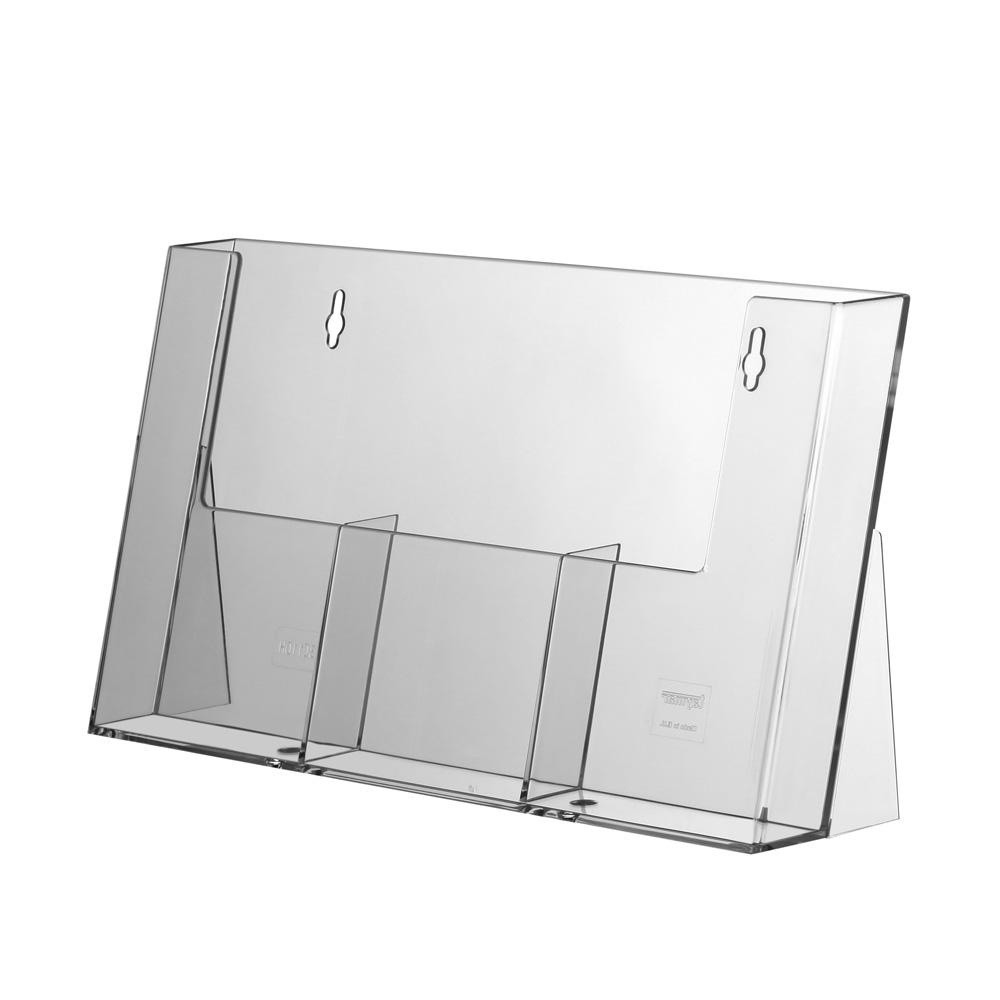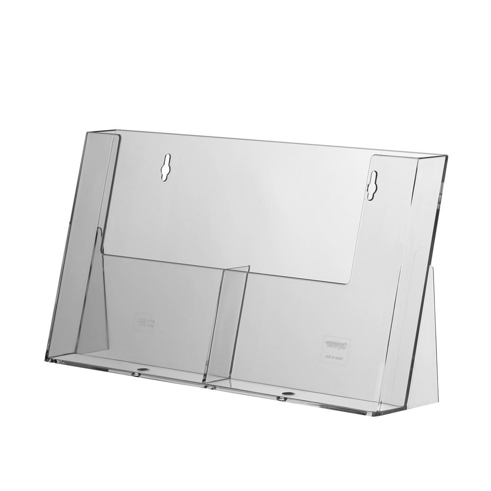 Denne bordholderen gjør det mulig å plassere brosjyrene side om side, slik at alle forsidene vises med full eksponering. Formatet er det klassiske ⅓ A4, som tilsvarer 10 x 21 cm, eller A5. Alle formater er i stående orientering.