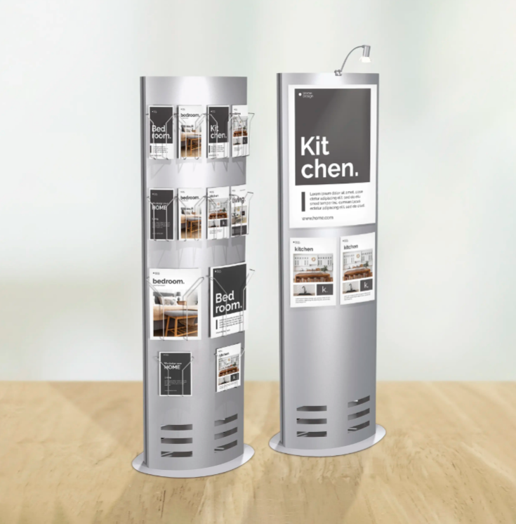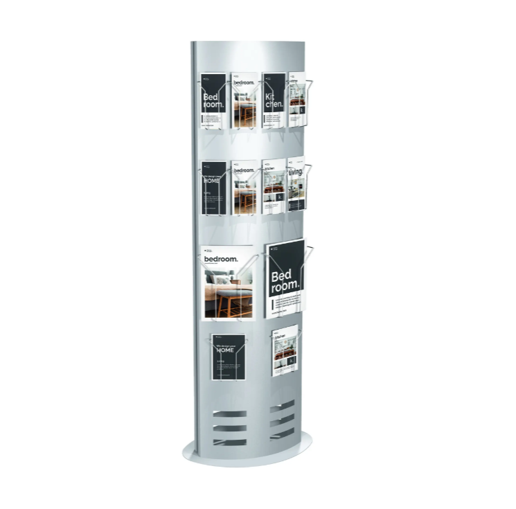Et kraftig, dobbeltsidig brosjyrestativ med stor presentasjonsflate. Stativ, trådhengere til brosjyrer og plakatlommer selges separat ihht behov.