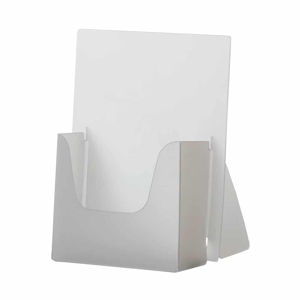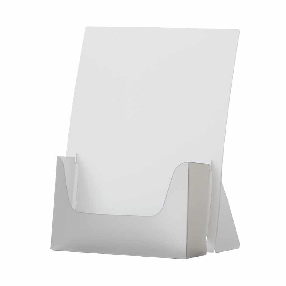 Frittstående holder for brosjyrer, foldere og annet informasjonsmateriell i stående format. Velegnet for plassering på bord og disk, og spesielt egnet når forsiden av brosjyren ønskes mest mulig eksponert. Den åpne fronten gjør at innholdet er godt synlig, men krever at trykksakene holder formen og ikke bøyer seg fremover over tid, for eksempel ved fukt.