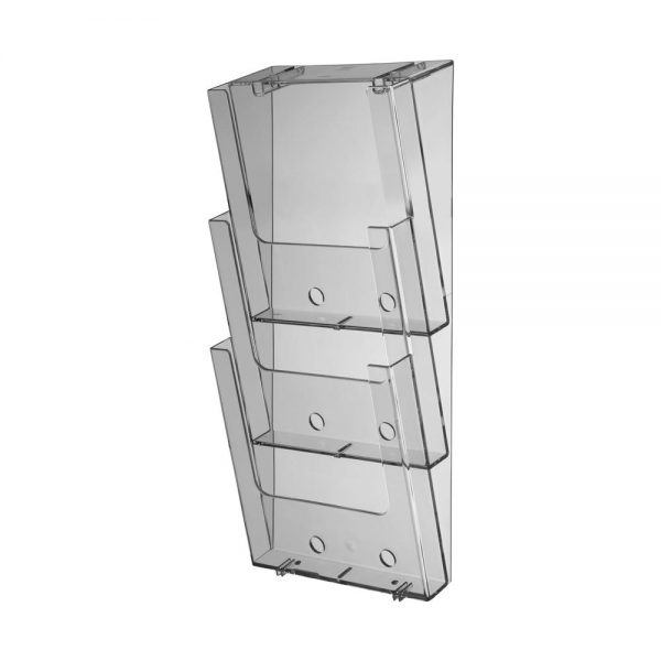 Denne brosjyreholderen er egnet for enkle ark så vel som brosjyrer. Materialet er klar polystyrene, som er tilsvarende det som benyttes til plastflasker ol. Brosjyreholderne har derfor god bæreevne.