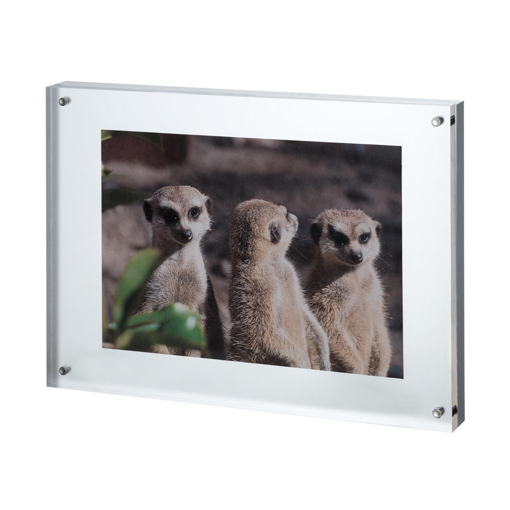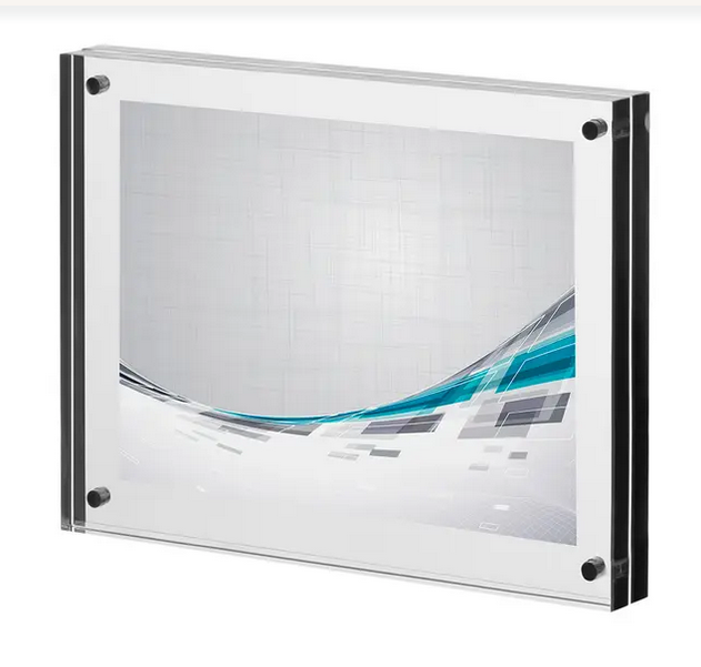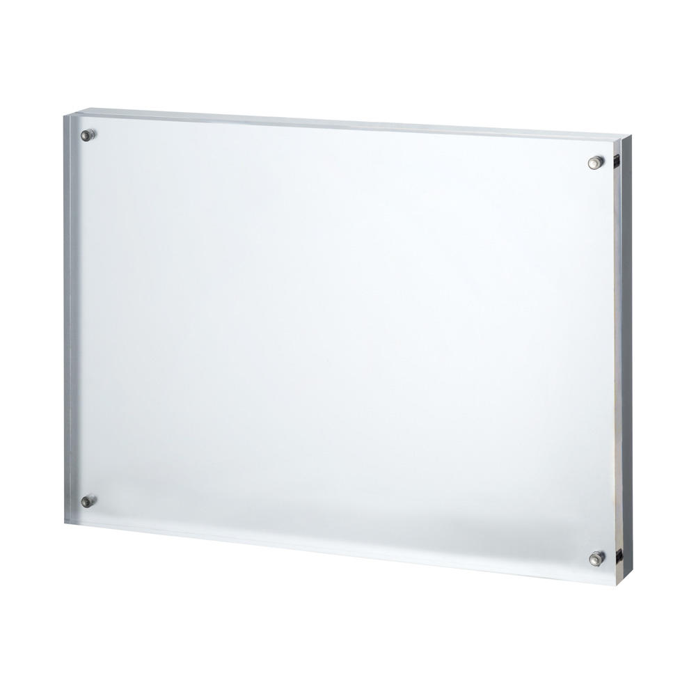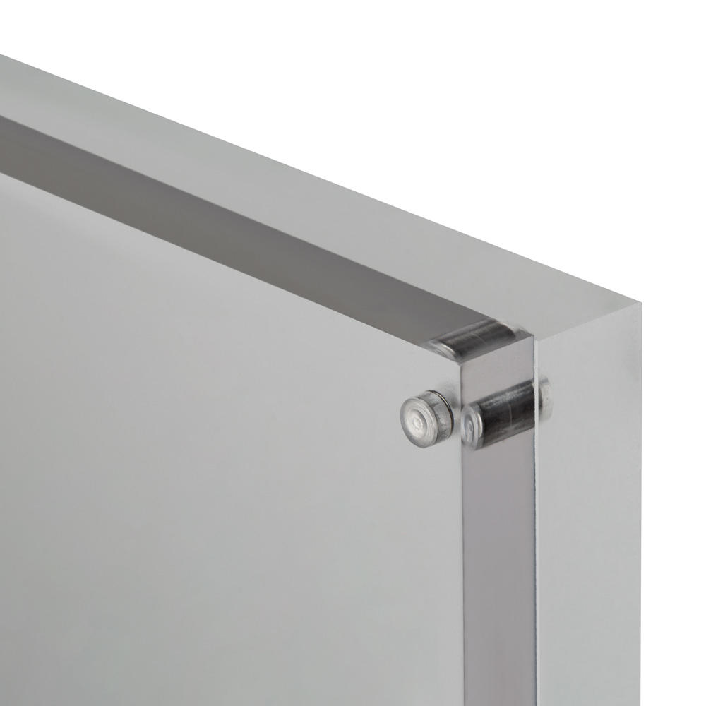 En stilren ramme til å presentere prisinformasjon, flyers, visittkort, bilder ol. Består av 2 akrylplater på 10 mm, og rammen plasseres rett på bordet. Platene holdes sammen av 4 innstøpte magneter, som gjør skifte av plakat raskt og enkelt.