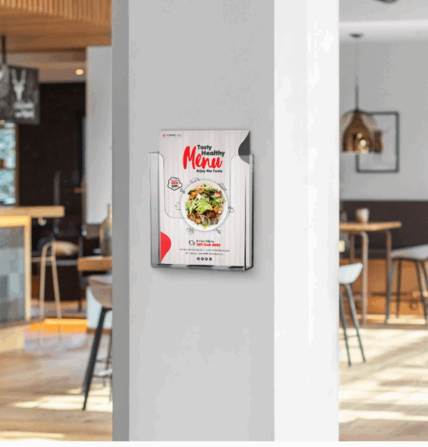 Eksponer brosjyren din i denne veggmonterte holderen. Tilgjengelig format: A4, A5 og 1/3 A4 (tilsvarende 10 x 21 cm).