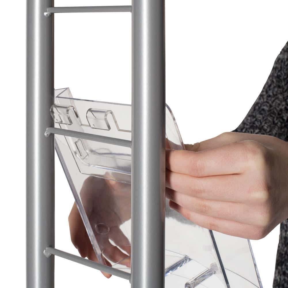 Brosjyreholderne monteres ved hjelp av adaptere på de horisontale spilene. Rammen kan benyttes på begge sider til format A4, A5 eller 1/3 A4.