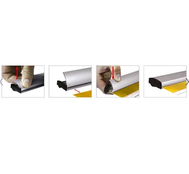 Hver enhet består av to sølvelokserte aluminiumsprofiler med sorte, roterbare endestykker. Den øverste klemmen har to justerbare opphengsøyer som gjør monteringen enkel både i tak og på vegg. Den nederste klemmen fungerer som tyngde og sørger for at banneret henger jevnt og uten folder.