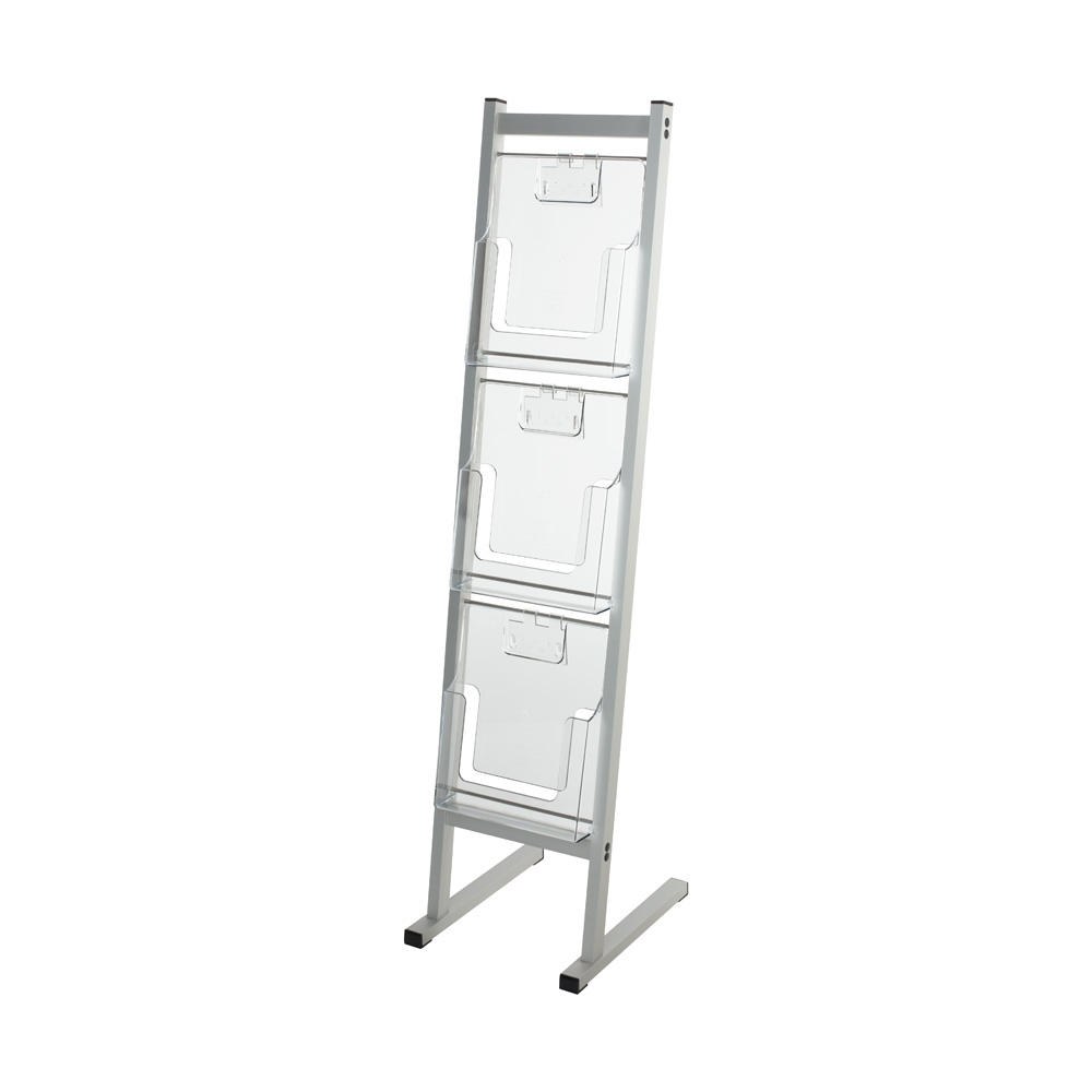 Rammen er laget av sølvanodiserte aluminiumsprofiler (20 x 30 mm), som gir brosjyrestativet god stabilitet. Den lett bakoverlente formen sikrer at innholdet presenteres på en godt synlig måte.