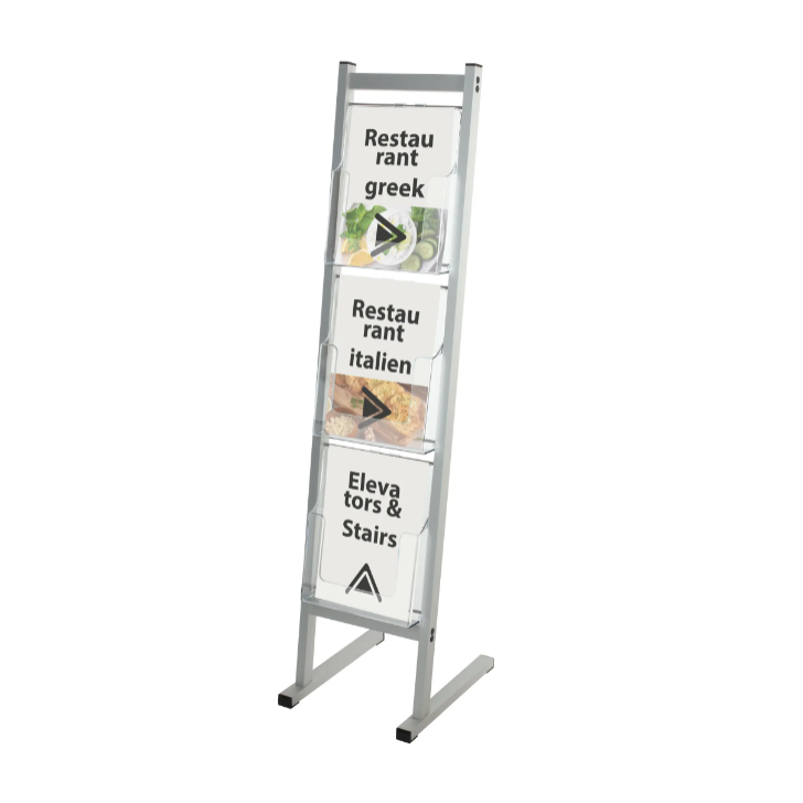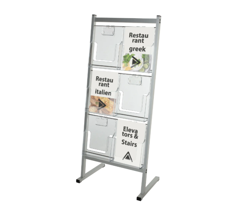 Brosjyrestativet leveres med brosjyreholdere i krystallklar polystyren, som festes med adaptere på de integrerte runde stengene. Det frittstående stativet kan fås med 3 eller 6 brosjyreholdere, hver med en fyllingsdybde på 30 mm. Opphøyde kanter sørger for ekstra stabilisering av brosjyrer og flygeblad, samtidig som de fremheves på en profesjonell og innbydende måte.