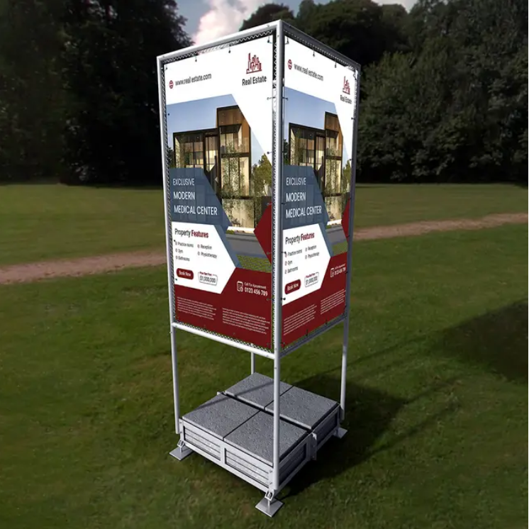 Fang oppmerksomheten fra alle vinkler med Mobil Reklamestativ! Dette stativet er designet for maksimal fleksibilitet og er utstyrt med en solid base som kan fylles med betongplater, noe som sikrer stabilitet samtidig som det er enkelt å flytte. Med bannerfester på alle fire sider vil ditt reklamebudskap skille seg ut uansett hvor det ses fra. Tilpass bannere med ditt unike design, og vi leverer dem direkte til deg – klare til å gjøre inntrykk!