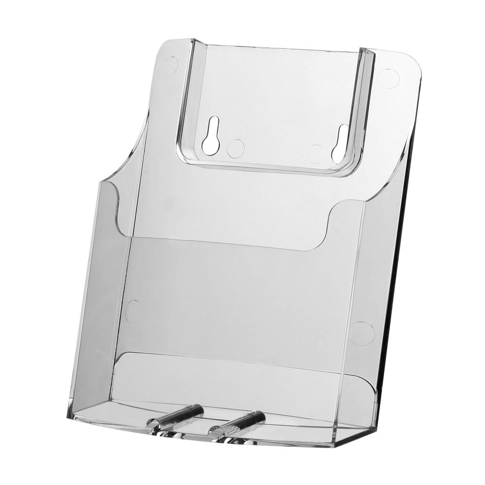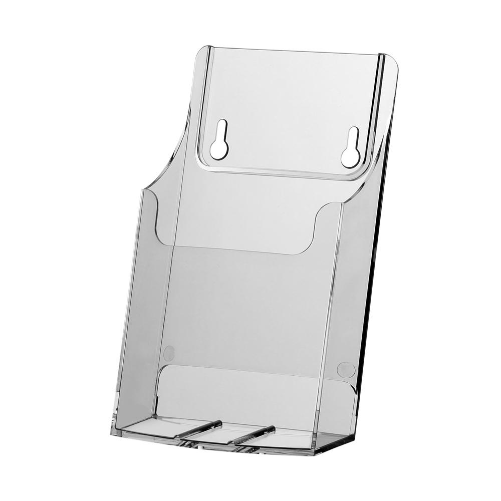Brosjyreholderen er formstøpt og består av krystallklar polysteren. Den leveres i standard, stående format A4, A5 og 1/3 A4.