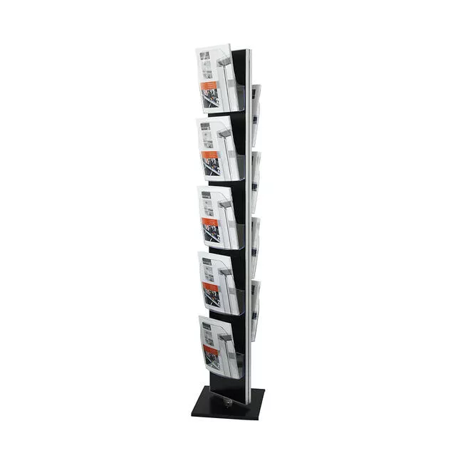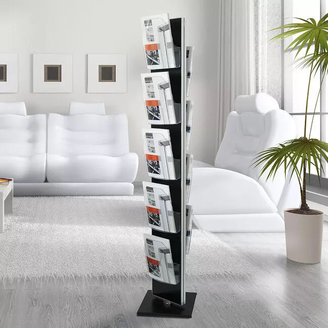 Denne slanke brosjyreholderen kan holde inntil 10 brosjyrelommer til format A4 eller A5, eller 18 stk lommer til format stående A6. Se illustrasjoner i bildegalleriet for mulige kombinasjoner av de tre formatene.