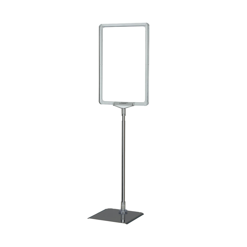 Fot i rustfritt stål, teleskopstang i kromet metall, ramme i plast. Rammen leveres i transparent, hvit, grå, sort, gul, oransje, blå og rød – til plakatformatene A3, A4, A5.