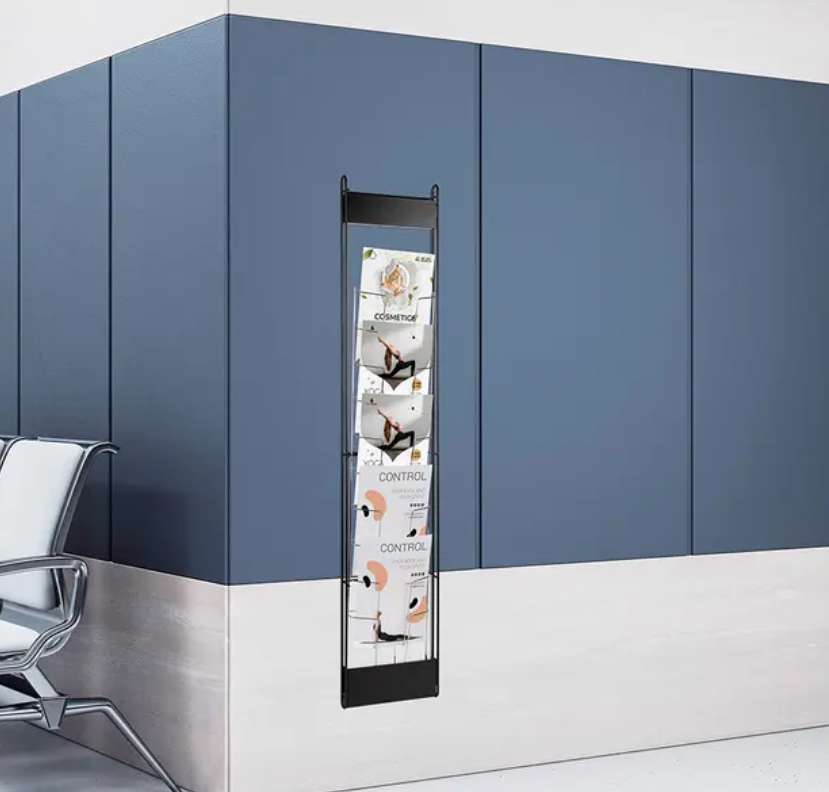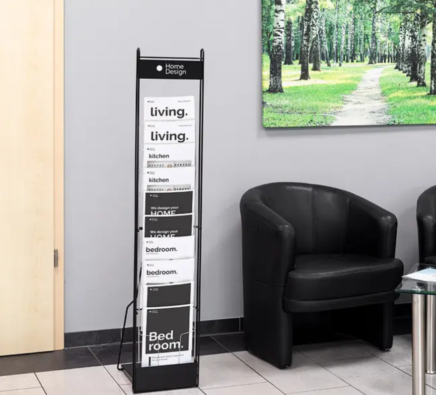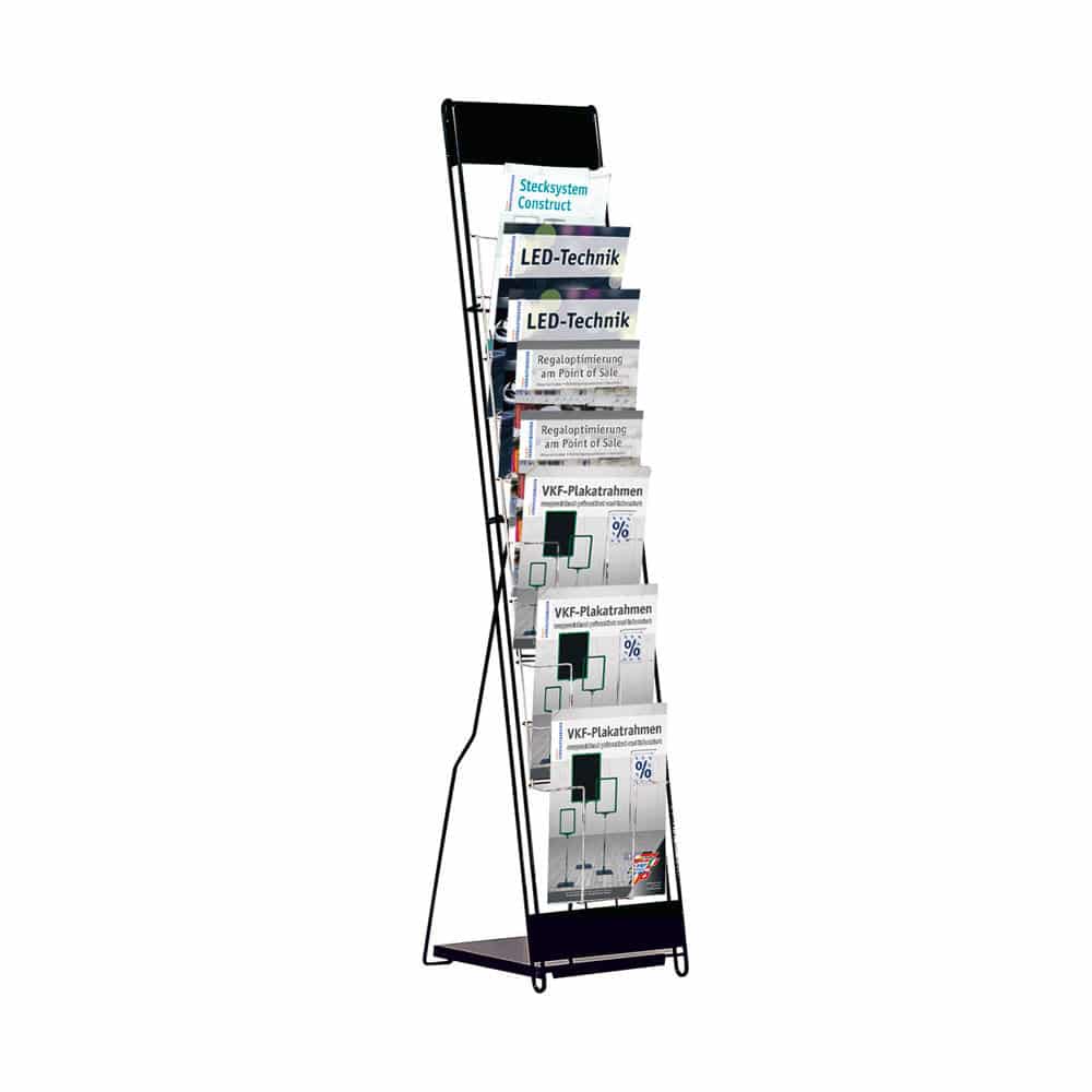 Et brosjyrestativ av stål i en fargekombinasjon av krom og svart. Egnet til aviser og blader, der det er behov for å eksponere flere ulike utgaver uten at det er nødvendig å vise hele forsidene i stativet.