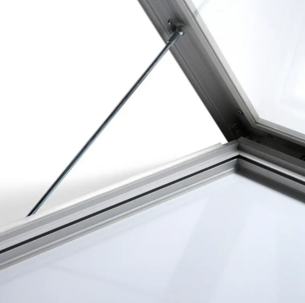 Døren er hengslet i toppen, åpnes oppover, og holdes oppe av stålstag, med gasstrykkfjærer i større utgaver. Alle formater fra 12 x A4 leveres med gassfjærer som gjør det enkelt å løfte opp frontglasset for å skifte innhold. Tavlen har en hvit magnettavle som også kan skrives på med markerpenn. Den leveres med en lås med stk. to nøkler.