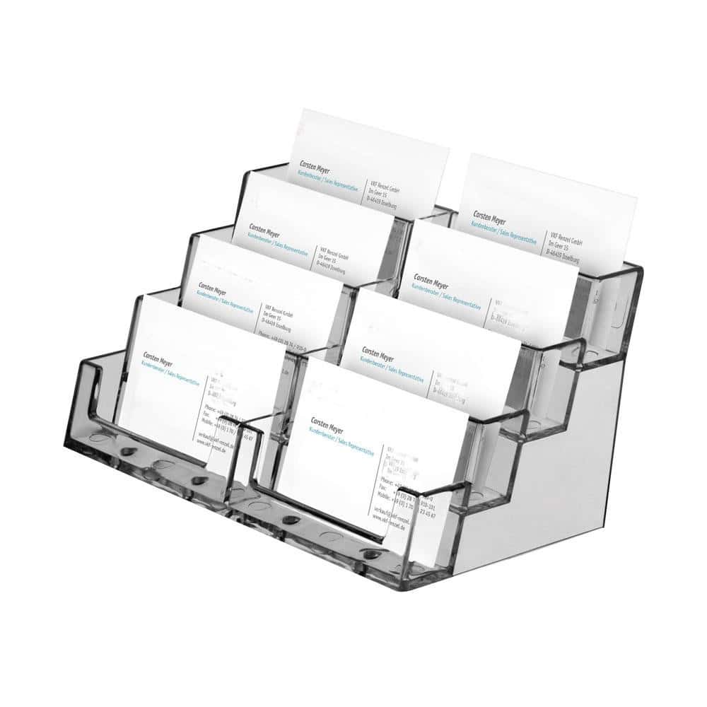 Visittkortholder for 8 kort med bredde 93 mm. Dybde lommer: 17 mm.